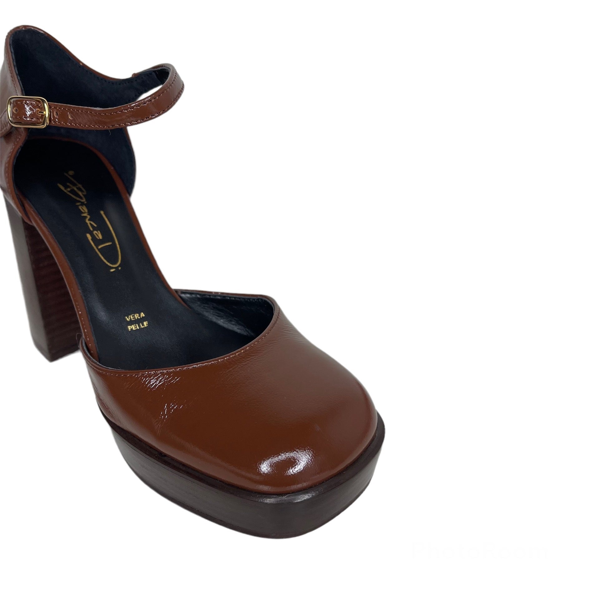 Décolleté in naplak, punta tonda, con cinturino alla caviglia regolabile, tacco largo 90mm, plateau 20mm, suola in tunit. Made in Italy.