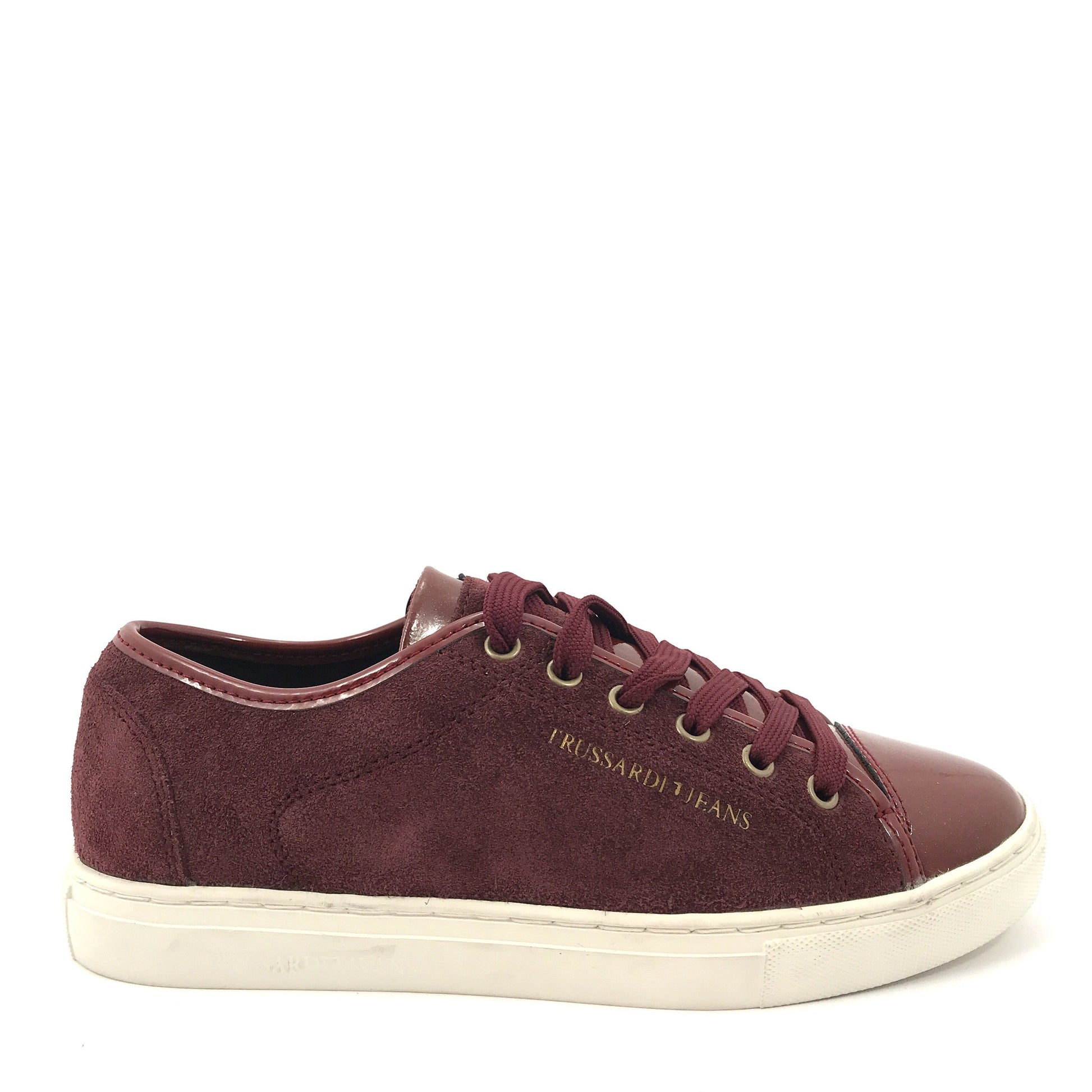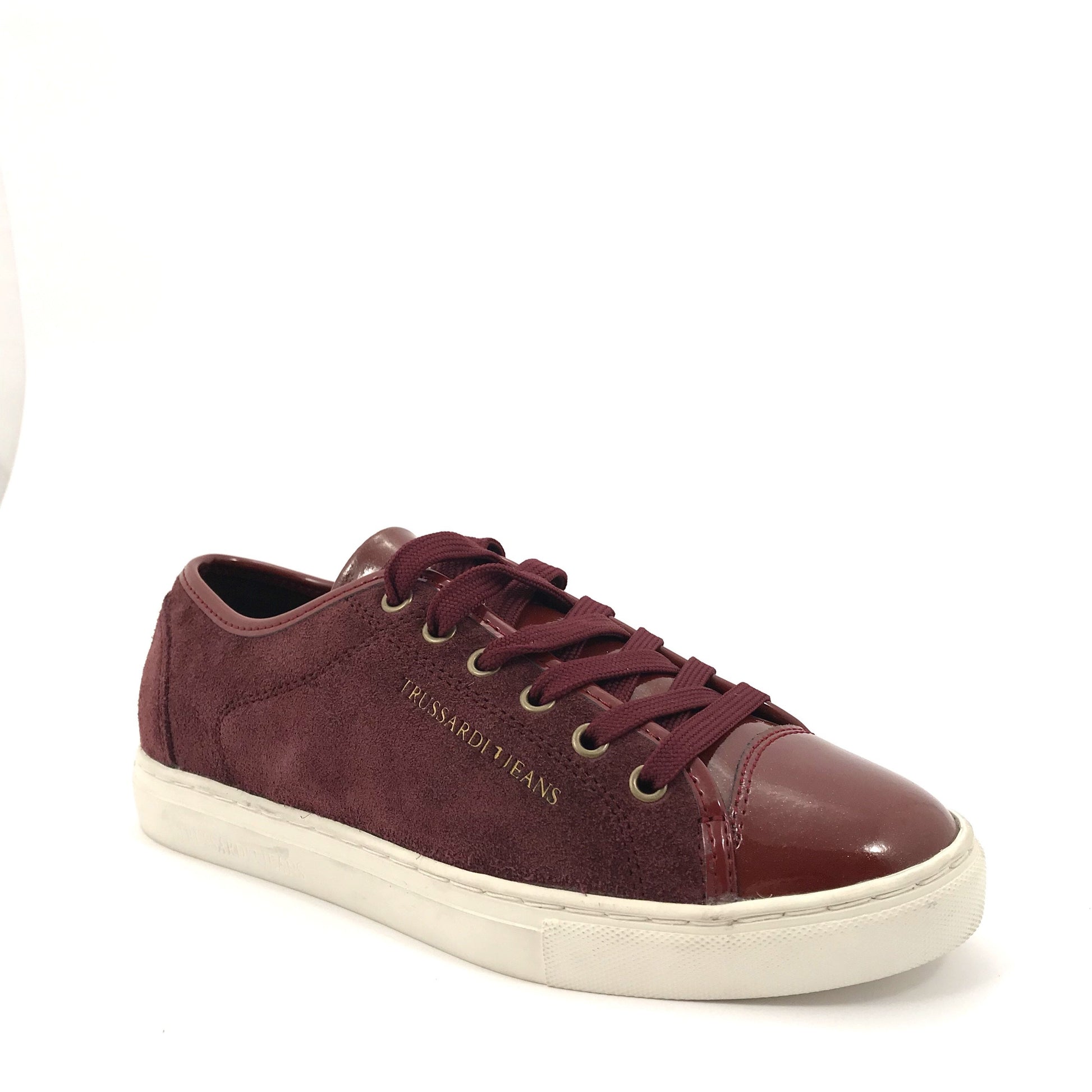 Sneakers in camoscio e vernice, chiusura con lacci, interno in pelle e tessuto, fondo 2 cm, suola in gomma.